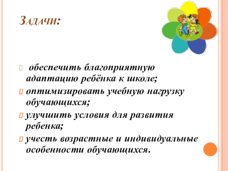 Задачи: обеспечить благоприятную адаптацию ребёнка к школе; оптимизировать учебную нагрузку обучающихся; улучшить условия для развития ребенка; учесть
