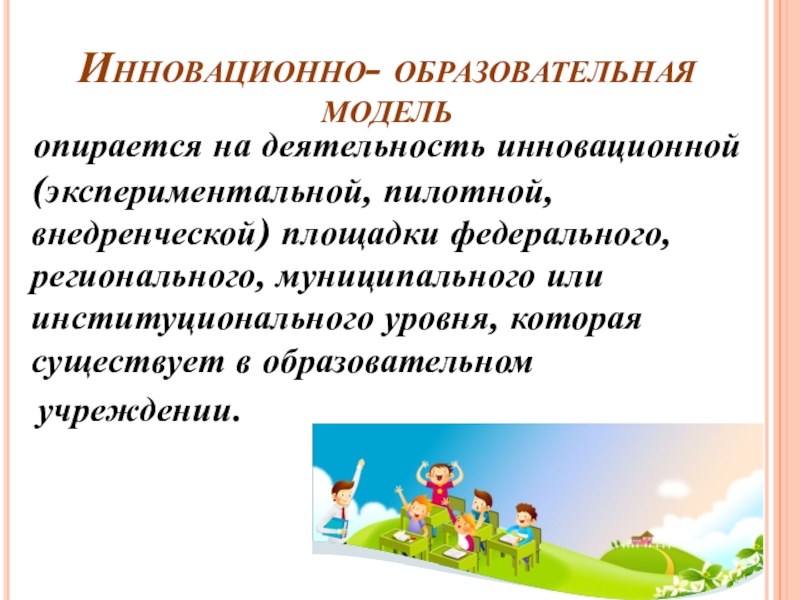 Инновационно- образовательная модель опирается на деятельность инновационной (экспериментальной, пилотной, внедренческой) площадки федерального, регионального, муниципального или институционального уровня,