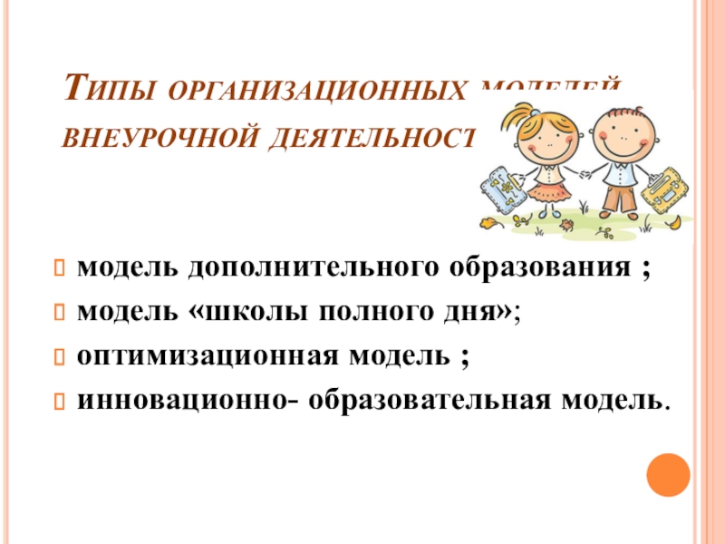 Типы организационных моделей внеурочной деятельности  модель дополнительного образования ;модель «школы полного дня»; оптимизационная модель ;инновационно- образовательная