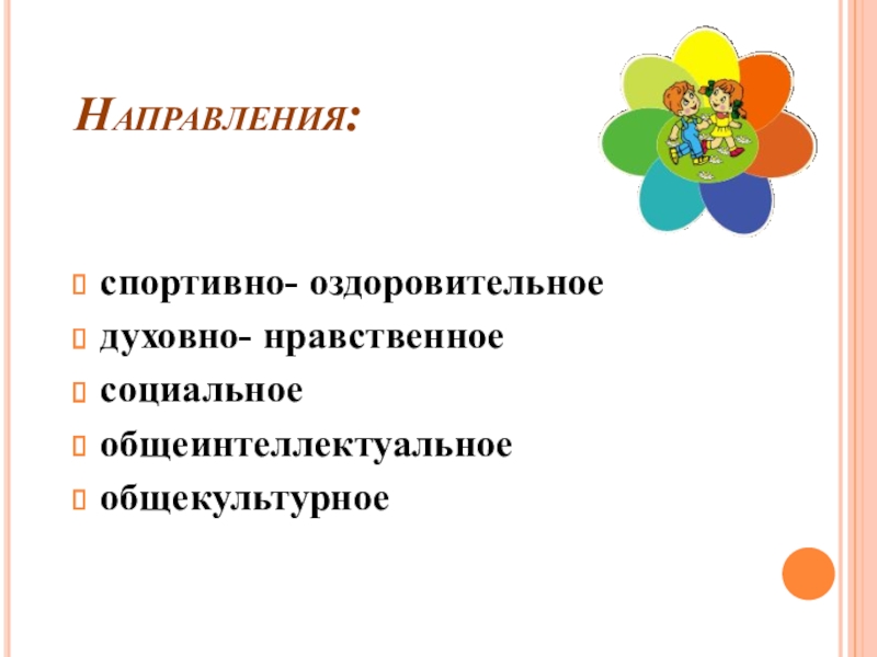 Направления:спортивно- оздоровительноедуховно- нравственноесоциальноеобщеинтеллектуальноеобщекультурное