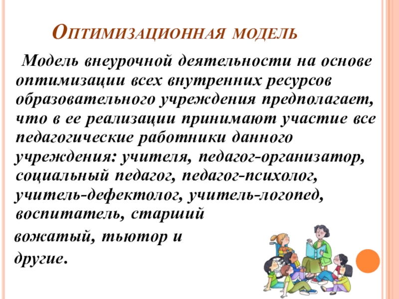 Оптимизационная модель  Модель внеурочной деятельности на основе оптимизации всех внутренних ресурсов образовательного учреждения предполагает, что в