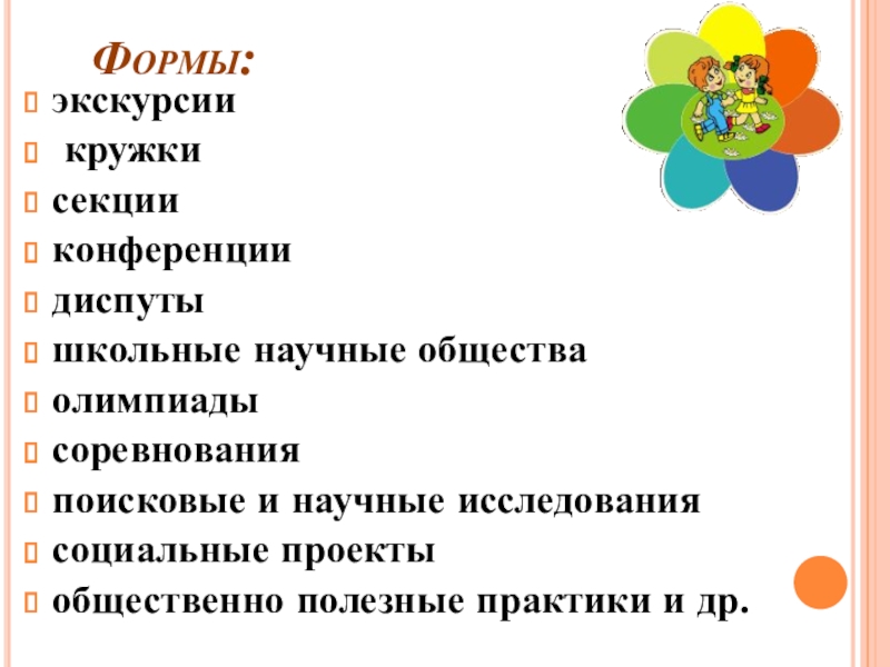 Формы: экскурсии кружки секцииконференции диспуты школьные научные общества олимпиадысоревнования поисковые и научные исследования социальные проектыобщественно полезные практики