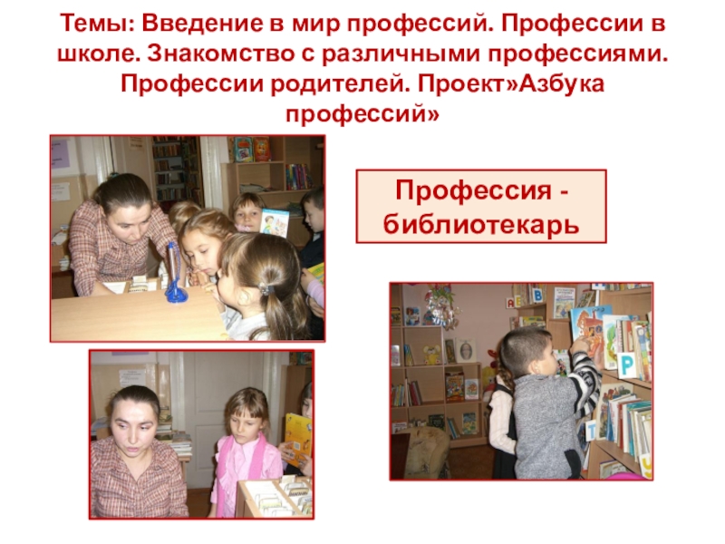 Слайд 34Темы: Введение в мир профессий. Профессии в школе. Знакомство с различными