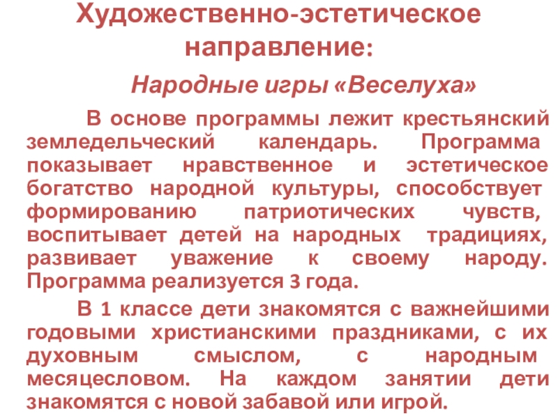 В основе программы лежит крестьянский земледельческий календарь. Программа показывает нравственное и эстетическое богатство народной культуры, способствует формированию патриотических чувств, воспитывает детей на народных традициях, развивает уважение к своему народу. Программа реализуется 3 года.