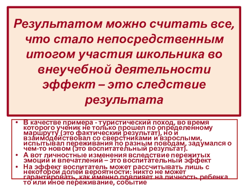 В качестве примера - туристический поход, во время которого ученик не только прошел по определенному маршруту (это фактический результат), но и взаимодействовал со сверстниками и взрослыми, испытывал переживания по разным поводам, задумался о чем-то новом (это воспитательный результат).