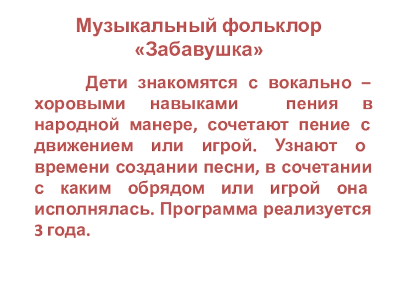 хоровыми навыками пения в народной манере, сочетают пение с движением или игрой. Узнают о времени создании песни, в сочетании с каким обрядом или игрой она исполнялась. Программа реализуется 3 года.