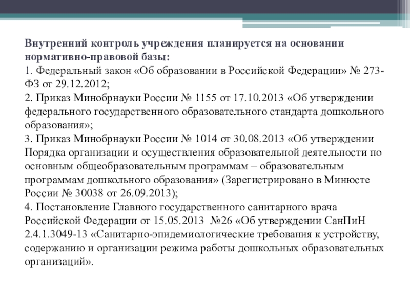 Внутренний контроль учреждения планируется на основании нормативно-правовой базы: 1. Федеральный закон «Об образовании в Российской Федерации» №