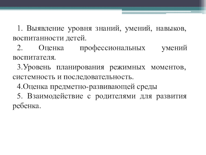 1. Выявление уровня знаний, умений, навыков, воспитанности детей. 2. Оценка профессиональных умений воспитателя. 3.Уровень планирования режимных моментов,