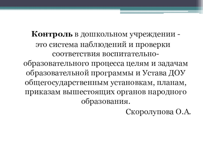Контроль в дошкольном учреждении - это система наблюдений и проверки соответствия воспитательно-образовательного процесса целям и задачам образовательной программы и Устава ДОУ общегосударственным установкам, планам, приказам вышестоящих органов народного образования. Скоролупова О.А.