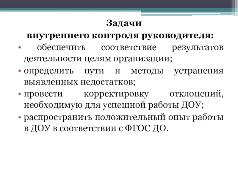 Задачи внутреннего контроля руководителя: обеспечить соответствие результатов деятельности целям организации;определить пути и методы устранения выявленных недостатков;провести