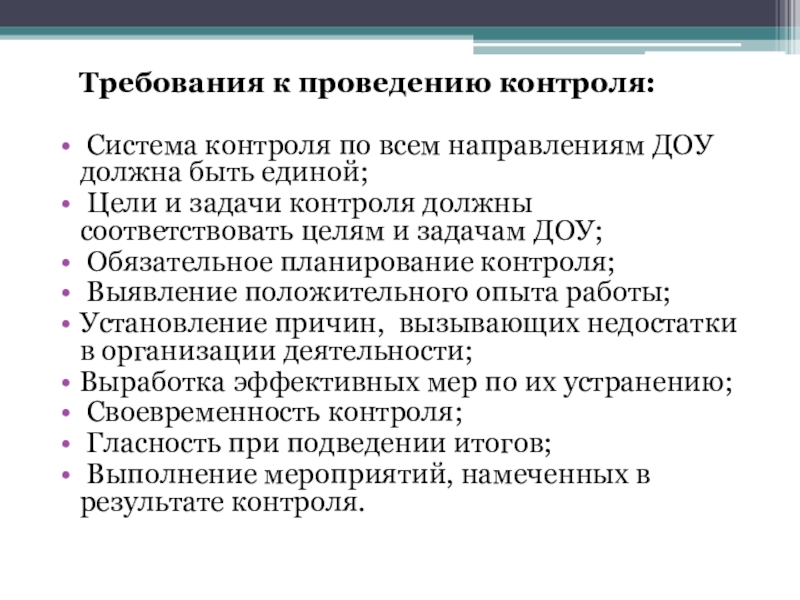 Требования к проведению контроля: Система контроля по всем направлениям ДОУ должна быть единой; Цели и задачи контроля