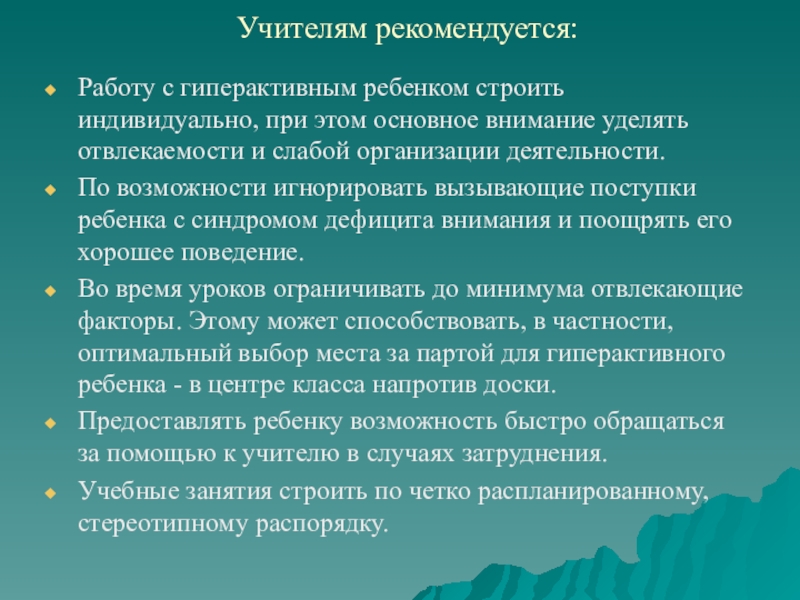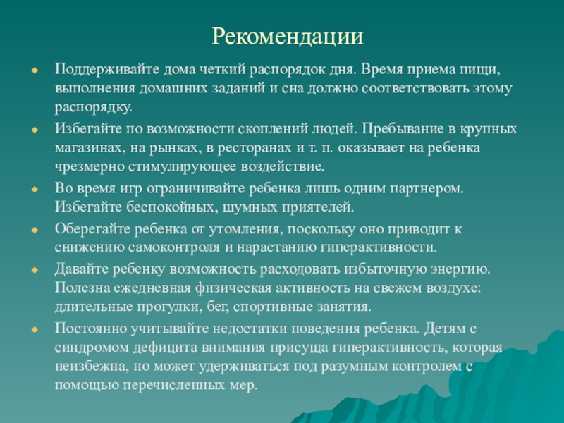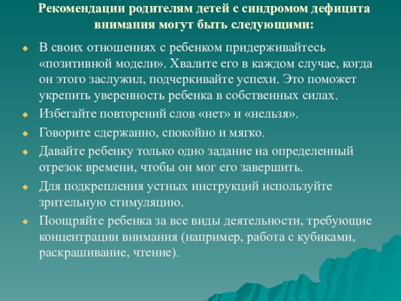Слайд 47Рекомендации родителям детей с синдромом дефицита внимания могут быть следующими: