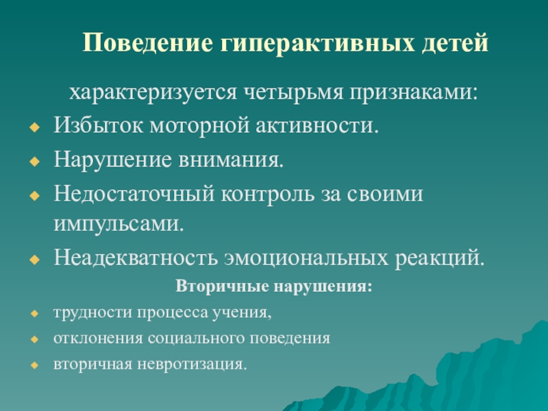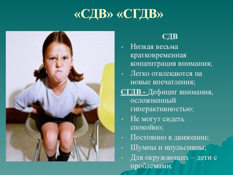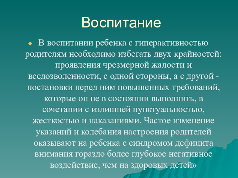 проявления чрезмерной жалости и вседозволенности, с одной стороны, а с другой - постановки перед ним повышенных требований, которые он не в состоянии выполнить, в сочетании с излишней пунктуальностью, жесткостью и наказаниями. Частое изменение указаний и колебания настроения родителей оказывают на ребенка с синдромом дефицита внимания гораздо более глубокое негативное воздействие, чем на здоровых детей»