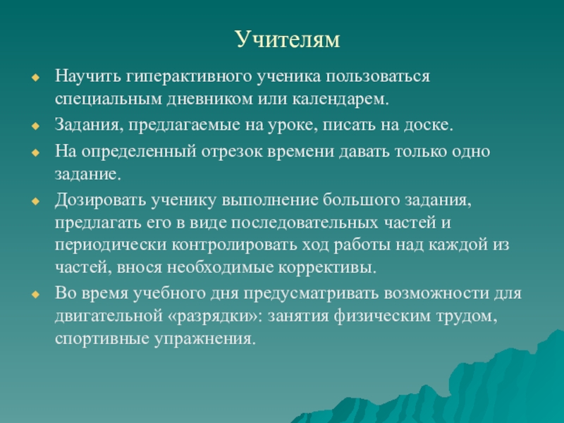 Дозировать ученику выполнение большого задания, предлагать его в виде последовательных частей и периодически контролировать ход работы над каждой из частей, внося необходимые коррективы.