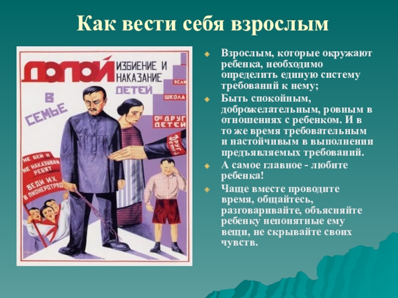 Быть спокойным, доброжелательным, ровным в отношениях с ребенком. И в то же время требовательным и настойчивым в выполнении предъявляемых требований.