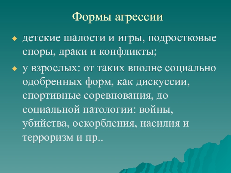 взрослых: от таких вполне социально одобренных форм, как дискуссии, спортивные соревнования, до социальной патологии: войны, убийства, оскорбления, насилия и терроризм и пр..