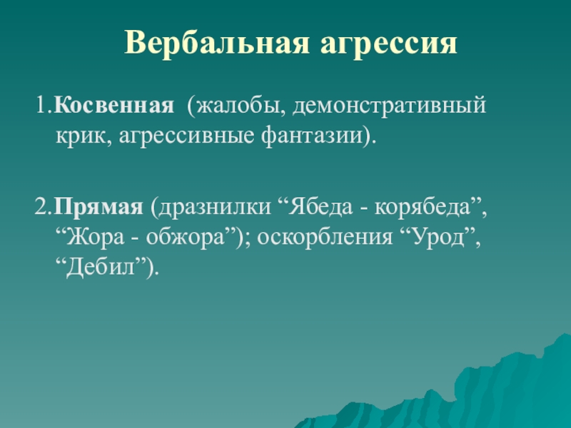 1.Косвенная (жалобы, демонстративный крик, агрессивные фантазии).