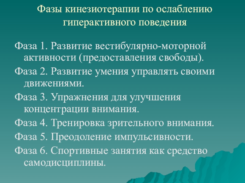 Слайд 53Фазы кинезиотерапии по ослаблению гиперактивного поведения