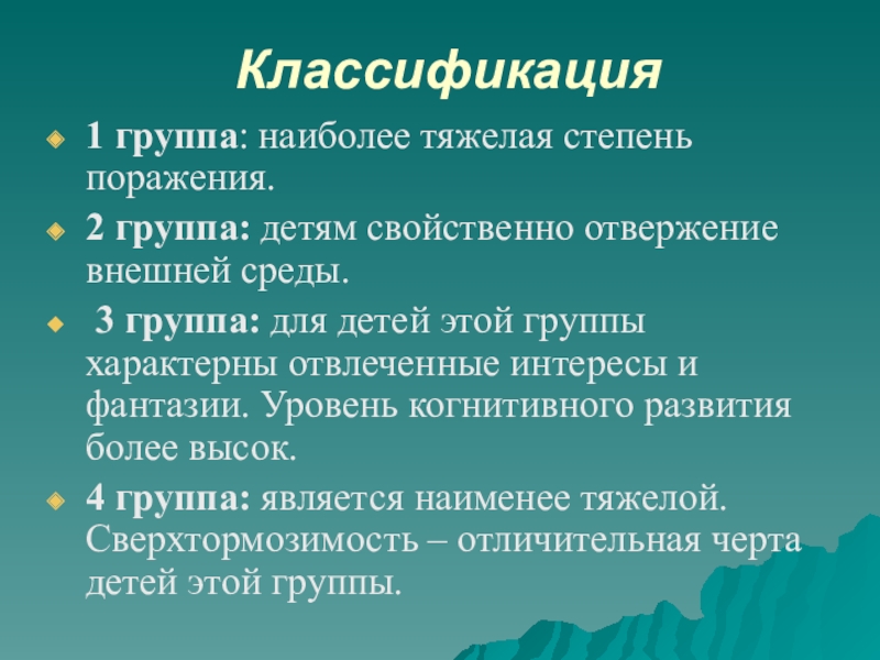 4 группа: является наименее тяжелой. Сверхтормозимость – отличительная черта детей этой группы.