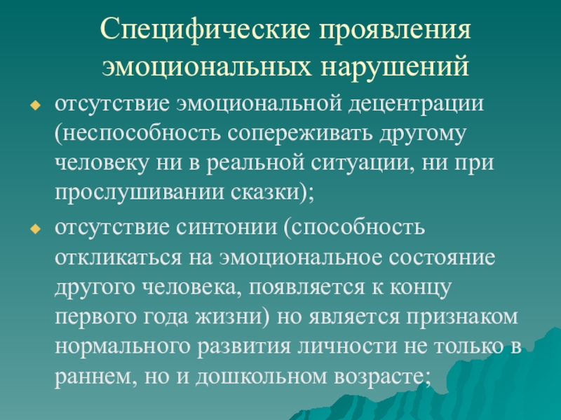 отсутствие синтонии (способность откликаться на эмоциональное состояние другого человека, появляется к концу первого года жизни) но является признаком нормального развития личности не только в раннем, но и дошкольном возрасте;