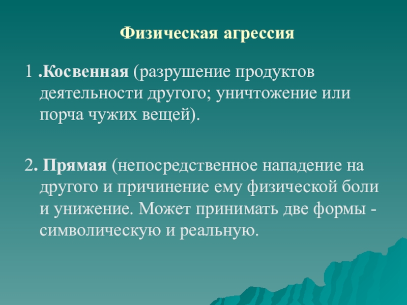 2. Прямая (непосредственное нападение на другого и причинение ему физической боли и унижение. Может принимать две формы - символическую и реальную.