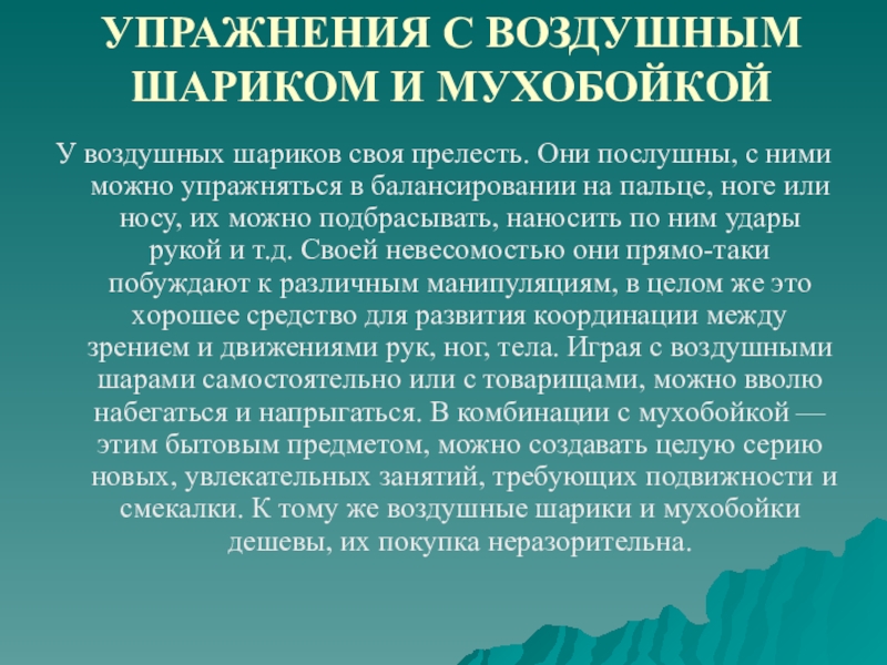 послушны, с ними можно упражняться в балансировании на пальце, ноге или носу, их можно подбрасывать, наносить по ним удары рукой и т.д. Своей невесомостью они прямо-таки побуждают к различным манипуляциям, в целом же это хорошее средство для развития координации между зрением и движениями рук, ног, тела. Играя с воздушными шарами самостоятельно или с товарищами, можно вволю набегаться и напрыгаться. В комбинации с мухобойкой — этим бытовым предметом, можно создавать целую серию новых, увлекательных занятий, требующих подвижности и смекалки. К тому же воздушные шарики и мухобойки дешевы, их покупка неразорительна.