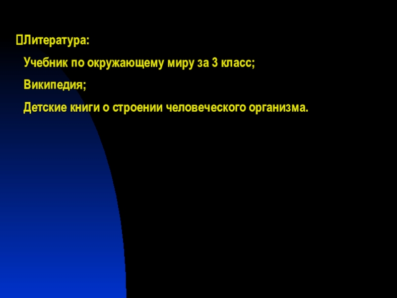 Литература:  Учебник по окружающему миру за 3 класс;  Википедия;  Детские книги о строении человеческого