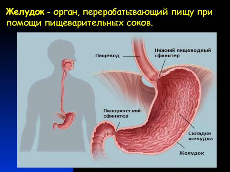Слайд 9Желудок - орган, перерабатывающий пищу при помощи пищеварительных соков.