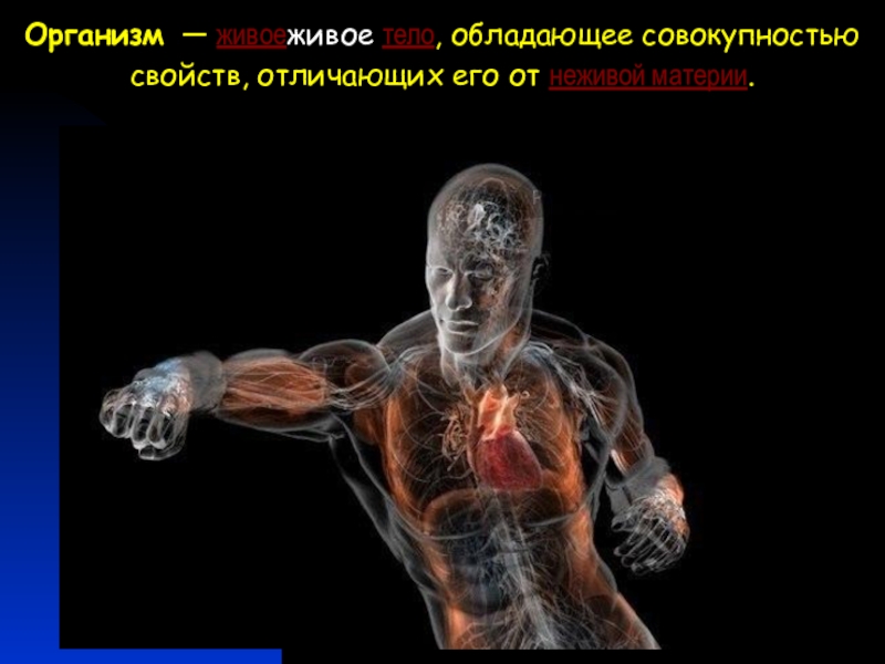Слайд 3Организм  — живоеживое тело, обладающее совокупностью свойств, отличающих его от неживой материи.