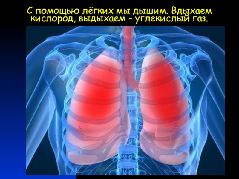 Слайд 7С помощью лёгких мы дышим. Вдыхаем кислород, выдыхаем - углекислый газ.