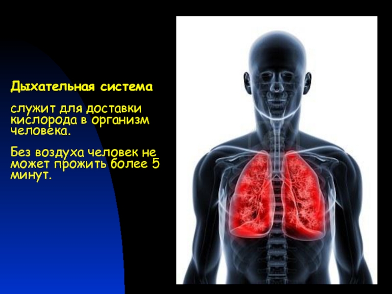 Слайд 5Дыхательная система служит для доставки кислорода в организм человека. Без воздуха