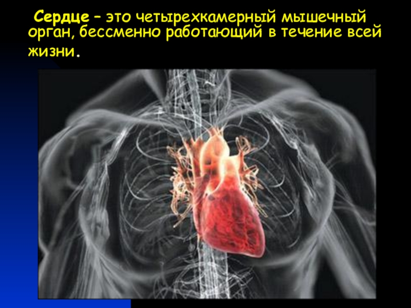 Слайд 11 Сердце – это четырехкамерный мышечный орган, бессменно работающий в течение всей жизни.