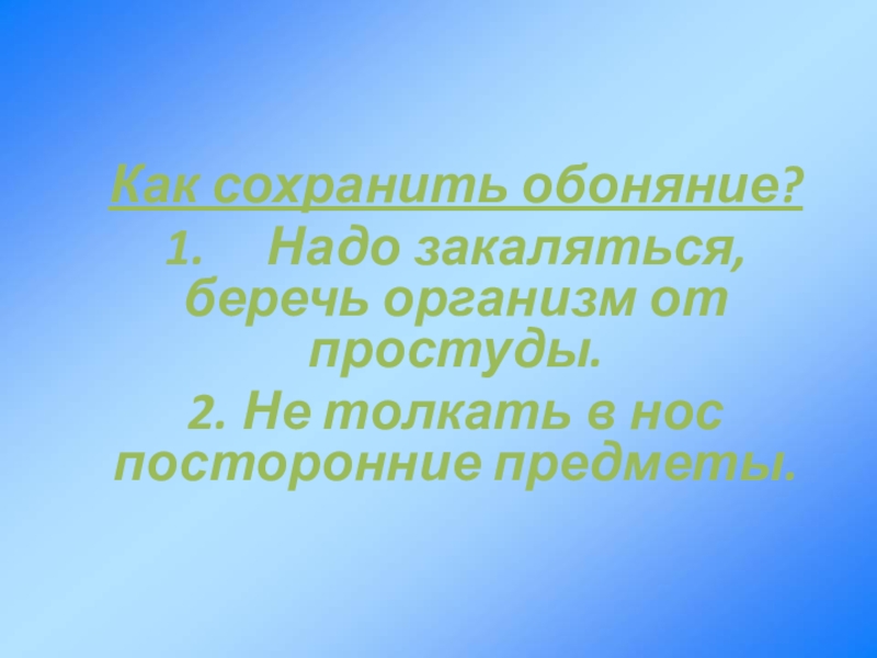 Как сохранить обоняние?1.   Надо закаляться, беречь организм от простуды.2. Не толкать в нос посторонние предметы.