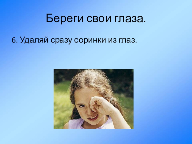 Береги свои глаза.6. Удаляй сразу соринки из глаз.
