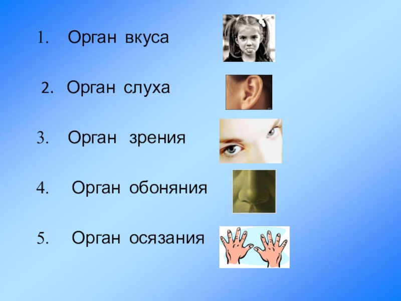 Орган вкуса2.  Орган слухаОрган  зрения Орган обоняния Орган осязания