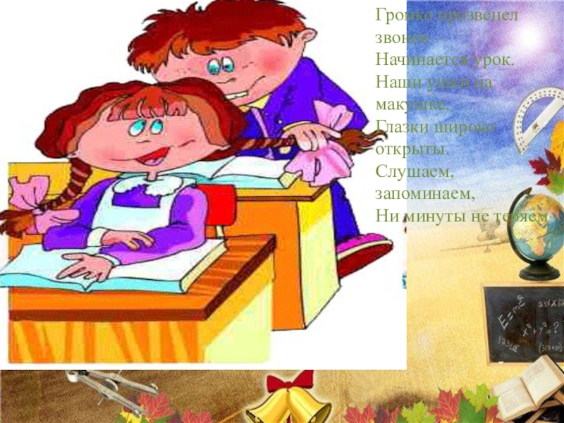 Громко прозвенел звонок –Начинается урок.Наши ушки на макушке,Глазки широко открыты.Слушаем, запоминаем,Ни минуты не теряем