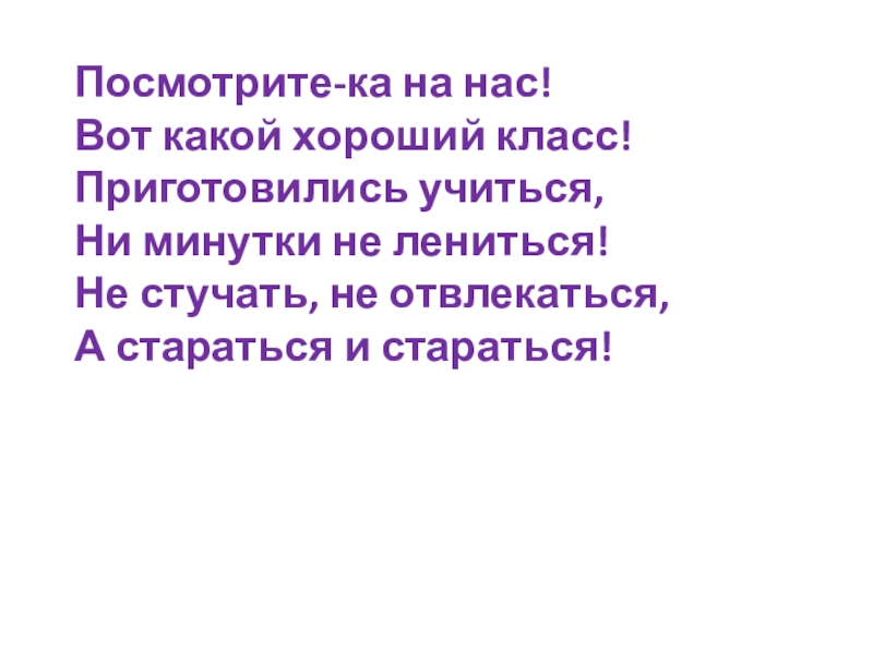 Слайд 3Посмотрите-ка на нас! Вот какой хороший класс! Приготовились учиться, Ни минутки не лениться! Не стучать,