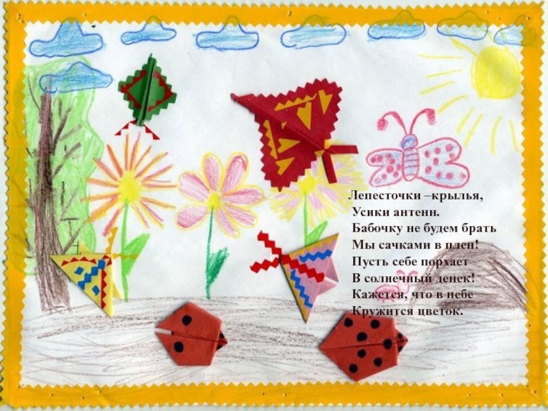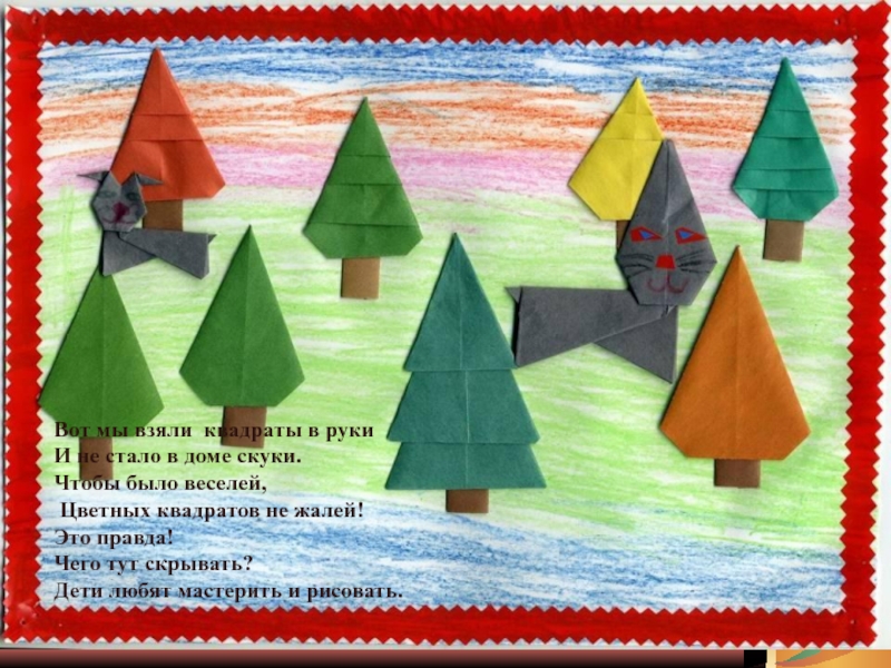Задачи: познакомить детей со свойствами разных видов бумаги, развивать внимание и интерес к конструированию из бумаги (оригами), знакомить с историей этого вида искусства; обучить детей простым видам техники (сминание, сгибание, разрывание); использование сотрудничества воспитателя с детьми с целью развития их творчества.