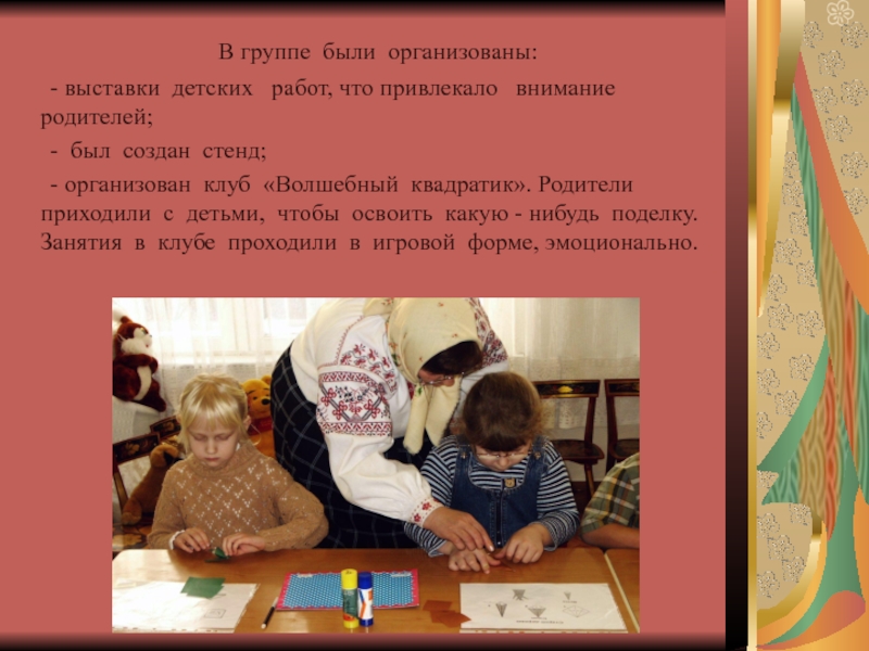 - организован клуб «Волшебный квадратик». Родители приходили с детьми, чтобы освоить какую - нибудь поделку. Занятия в клубе проходили в игровой форме, эмоционально.
