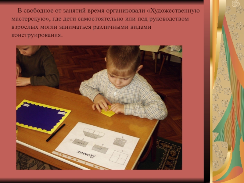 «Художественную мастерскую», где дети самостоятельно или под руководством взрослых могли заниматься различными видами конструирования.