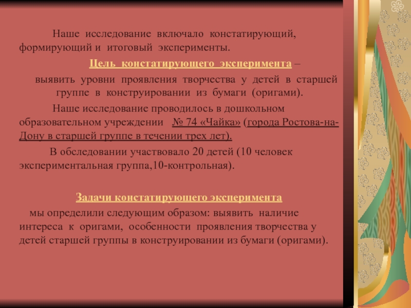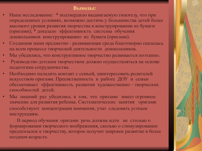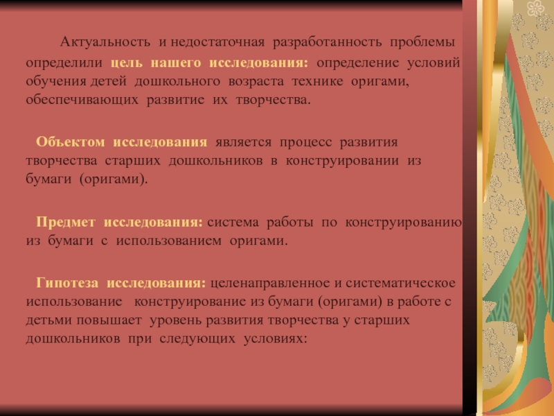 Гипотеза исследования: целенаправленное и систематическое использование конструирование из бумаги (оригами) в работе с детьми повышает уровень развития творчества у старших дошкольников при следующих условиях: