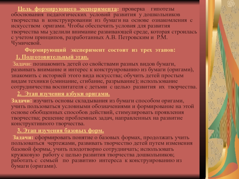 гипотезы обоснования педагогических условий развития у дошкольников творчества в конструировании из бумаги на основе ознакомления с искусством оригами. Чтобы обеспечить условия для развития творчества мы уделили внимание развивающей среде, которая строилась с учетом принципов, разработанных А.В. Петровским и Р.М. Чумичевой.