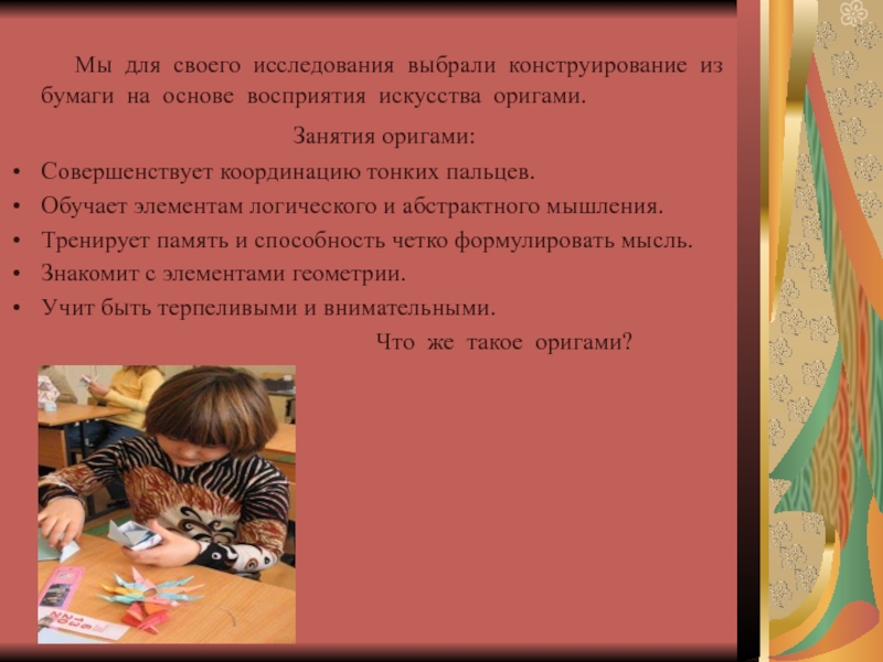 своего исследования выбрали конструирование из бумаги на основе восприятия искусства оригами.
