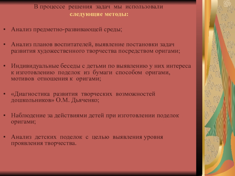 Анализ планов воспитателей, выявление постановки задач развития художественного творчества посредством оригами;
