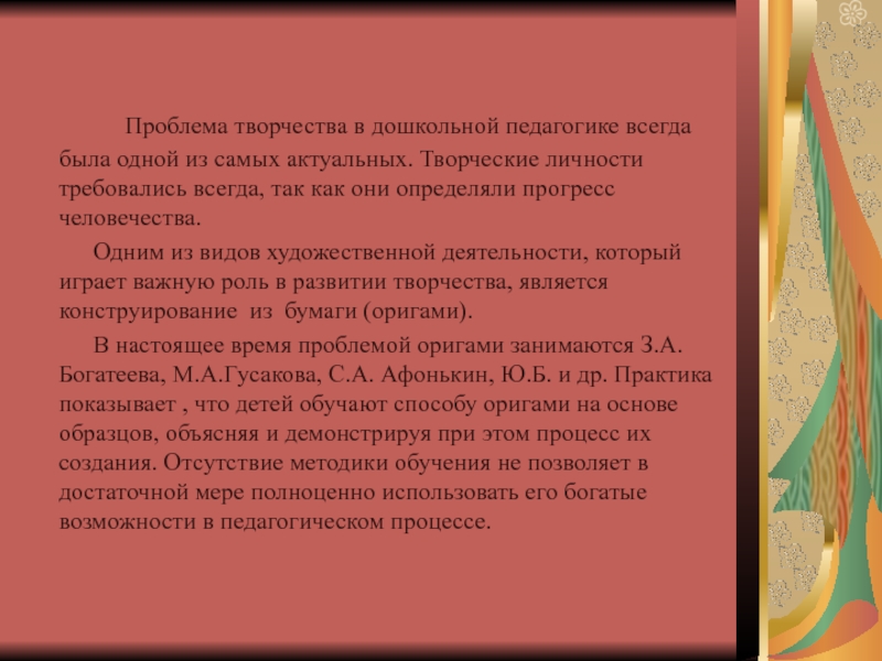 В настоящее время проблемой оригами занимаются З.А. Богатеева, М.А.Гусакова, С.А. Афонькин, Ю.Б. и др. Практика показывает , что детей обучают способу оригами на основе образцов, объясняя и демонстрируя при этом процесс их создания. Отсутствие методики обучения не позволяет в достаточной мере полноценно использовать его богатые возможности в педагогическом процессе.
