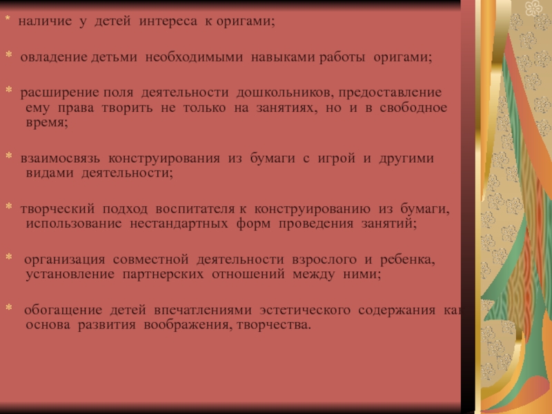 * творческий подход воспитателя к конструированию из бумаги, использование нестандартных форм проведения занятий;
