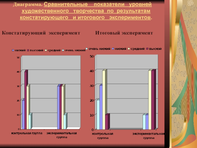 Слайд 26Диаграмма. Сравнительные показатели уровней художественного творчества по