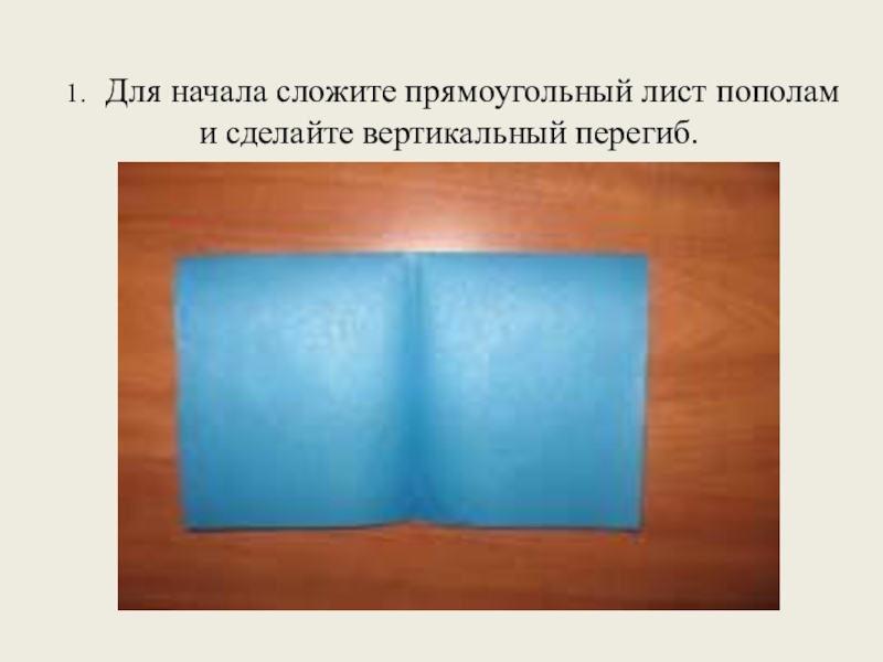 Слайд 71. Для начала сложите прямоугольный лист пополам и сделайте вертикальный
