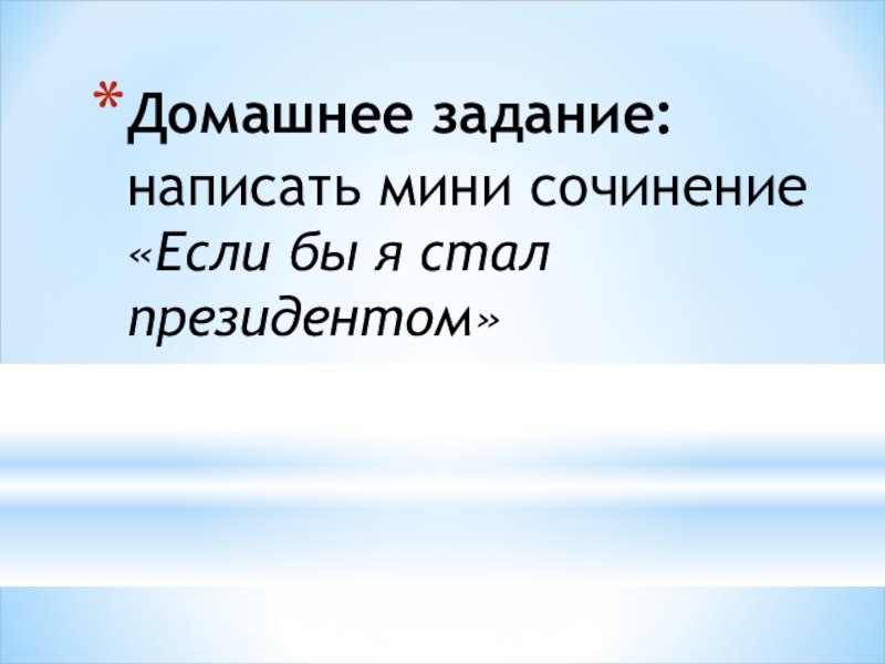 Слайд 12Домашнее задание: написать мини сочинение «Если бы я стал президентом»