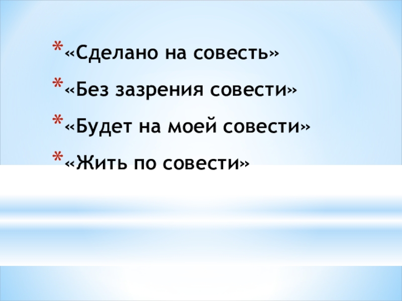 «Сделано на совесть»«Без зазрения совести»«Будет на моей совести»«Жить по совести»